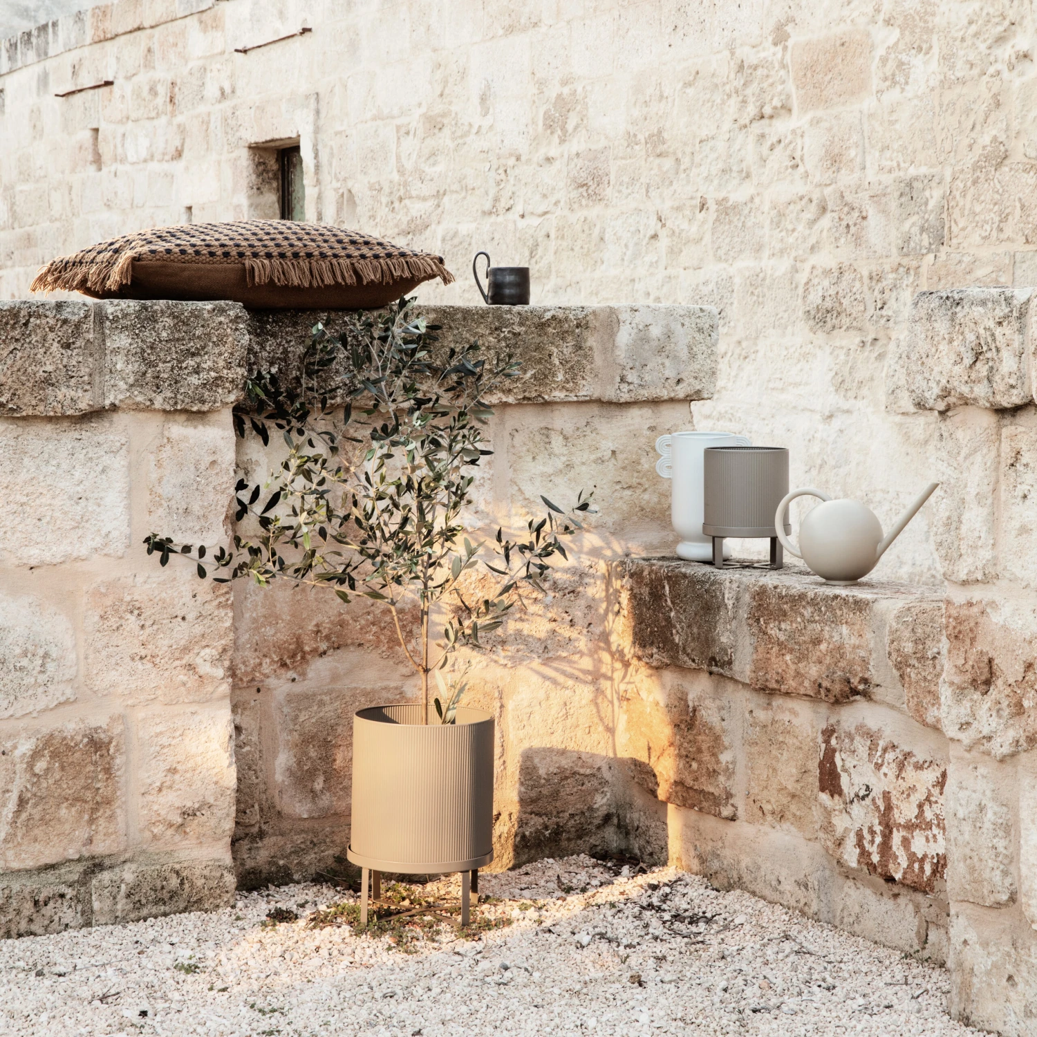 Bringen Sie Ihre Pflanzen in neue Höhen mit dem Bau Blumentopf klein von Ferm Living. Dieser Topf ist aus pulverbeschichtetem, galvanisiertem Stahl hergestellt und verfügt über eine dezent geriffelte Struktur, die ihm einen industriellen Eindruck verleiht, inspiriert von der Bauhaus-Architektur.